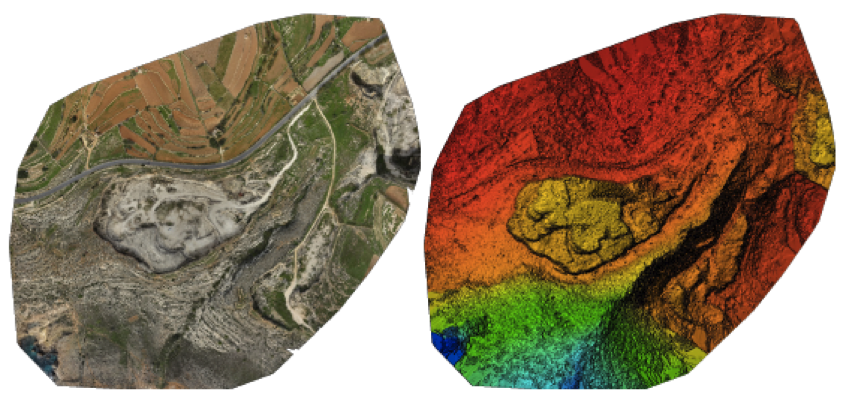 Orthomosaic (Left) and Digital Surface Model of a Quarry in Malta flown with an eBee UAV and processed using Pix4D for the Maltese Government to calculate the quarry’s volume.