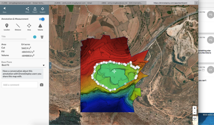 Screenshot using DroneDeploy to process Malta Quarry data to determine volume and area of quarry.