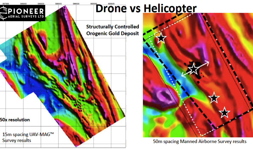 Comparison of Magnetic Survey resolution captured with a UAV (left) compared to a helicopter (right) courtesy of Pioneer Aerial Surveys Ltd.